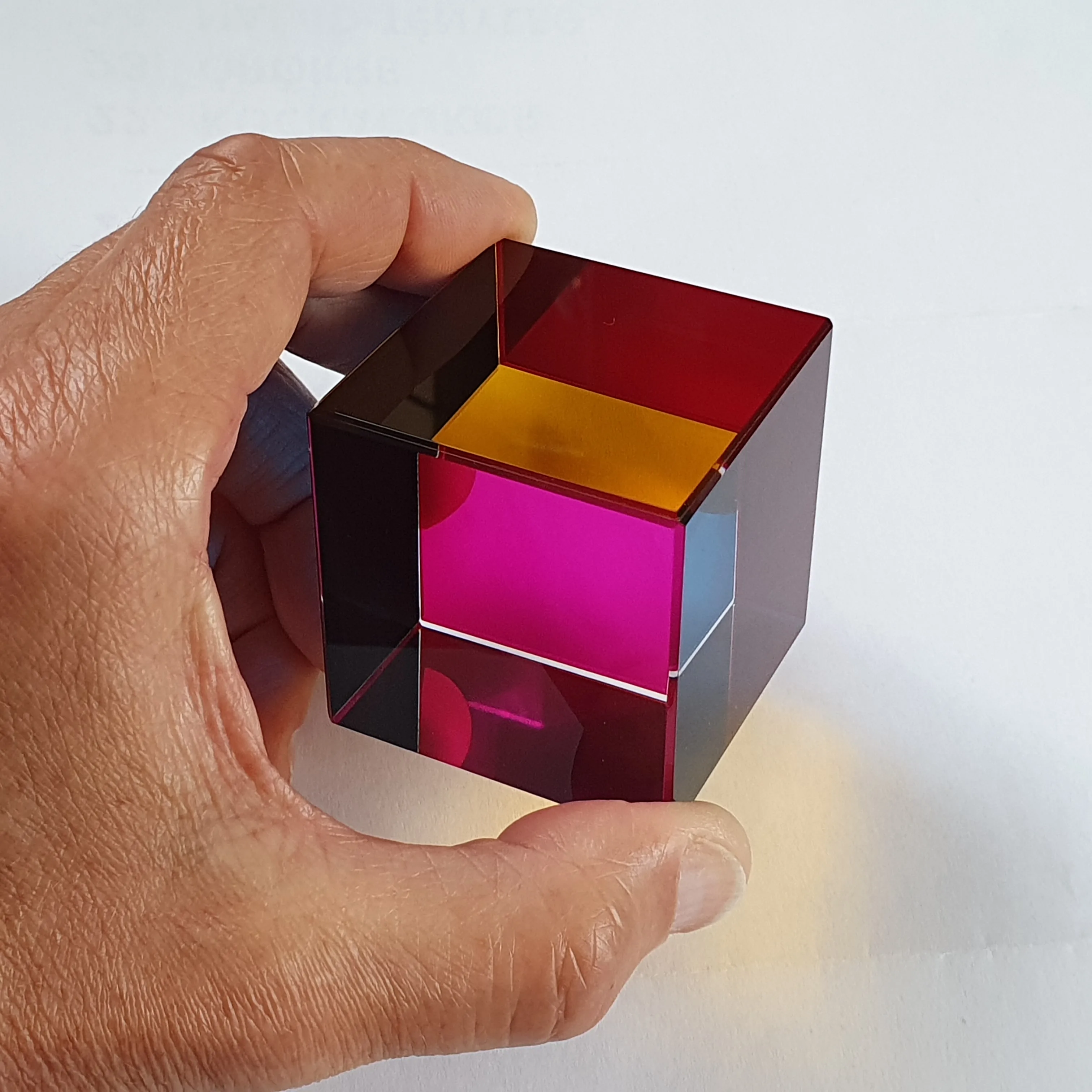 This CMY cube is a mesmerizing fusion of color, light, and creativity. Watch vibrant Cyan, Magenta, and Yellow layers blend into a shifting rainbow as light passes through. Perfect for desks, studios, or classrooms, this cube transforms any space into a living lesson in color theory and optical wonder.